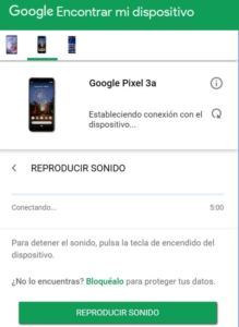 - Reproducir sonido: Si crees que tu móvil está cerca pero no puedes encontrarlo porque está en modo silencioso, puedes usar la opción “Reproducir sonido“. Esta función hará que tu móvil suene a todo volumen durante cinco minutos, incluso si lo tienes en silencio o en vibración. Es una excelente opción si lo has perdido en tu casa, en la oficina o en la casa de un amigo y no puedes escucharlo.