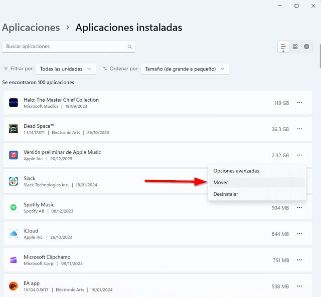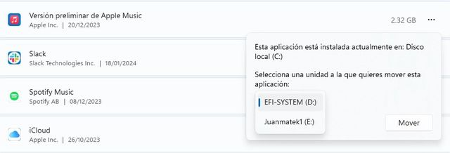Este es el método más sencillo y accesible para la mayoría de usuarios. Windows 11 permite trasladar ciertas aplicaciones —principalmente las descargadas desde Microsoft Store— desde la configuración del sistema sin necesidad de usar comandos o herramientas externas.
