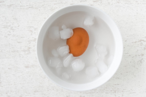 Lo que tenemos que hacer aquí es lo siguiente: una vez que el huevo esté listo, lo ponemos en un recipiente con agua fría. Dejamos enfriar un rato y luego, lo ponemos sobre la mesada (tabla, plato, lo que fuere) y lo hacemos rodar. La cáscara se desprenderá sola como muestra la imagen.