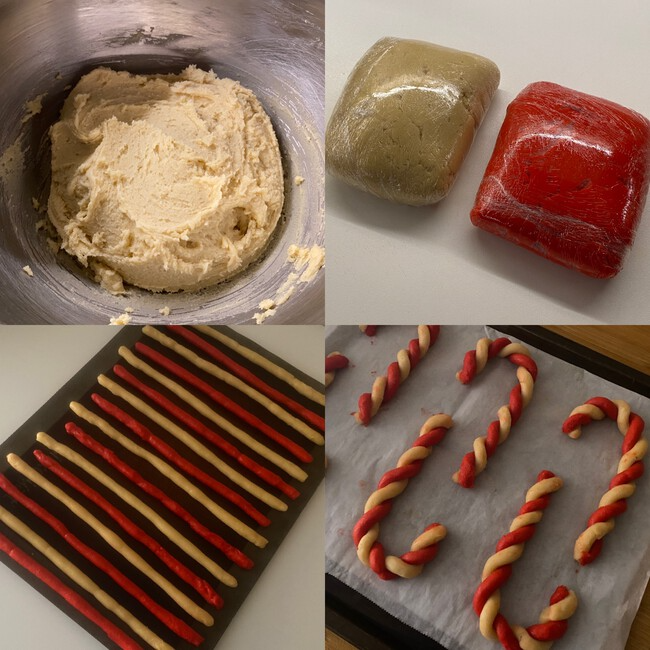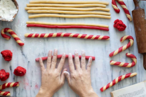 Pasado el tiempo de reposo, retira ambas masas del refrigerador. Toma porciones pequeñas de cada masa y rueda sobre una superficie limpia y ligeramente enharinada hasta formar tiras delgadas y alargadas. Asegúrate de que las tiras de ambos colores tengan el mismo grosor y longitud. Luego, coloca una tira roja junto a una natural y gíralas juntas para formar una espiral. Dobla un extremo de la espiral para darle la clásica forma de bastón.