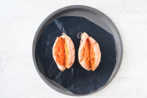 3-Una vez listos los boniatos, los retiramos del horno y dejamos que se enfríen ligeramente para poder manipularlos sin quemarnos. Con un cuchillo, hacemos un corte longitudinal en la parte superior, sin llegar a dividirlos por completo. Luego, realizamos pequeños cortes en el interior con cuidado, de manera que la pulpa quede más suelta y pueda mezclarse mejor con el relleno.