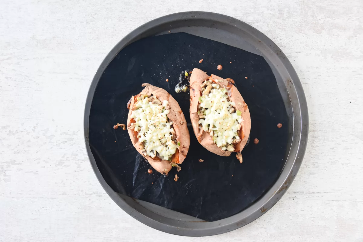 4-A continuación, rellenamos los boniatos con la mezcla de champiñones y cebolletas, distribuyéndola de manera uniforme. Sobre el relleno, añadimos el queso mozzarella rallado, que aportará cremosidad y un acabado gratinado muy apetecible.
