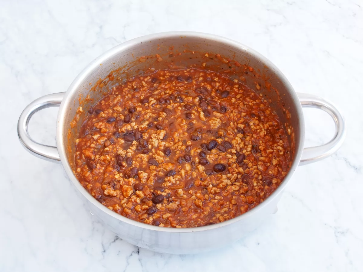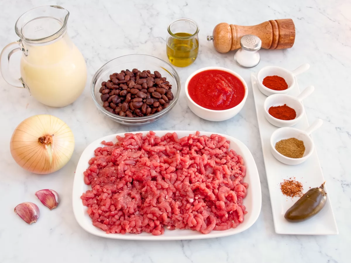 Tradicionalmente, se elabora con carne picada de ternera, que aporta cuerpo y sabor, y distintos tipos de chiles que le dan ese toque picante tan característico. Sin embargo, el nivel de picante puede ajustarse fácilmente según las preferencias personales. En esta versión, se utiliza chile jalapeño en conserva junto con chile en polvo, logrando una intensidad moderada que resulta agradable incluso para quienes no están acostumbrados a comidas muy picantes.