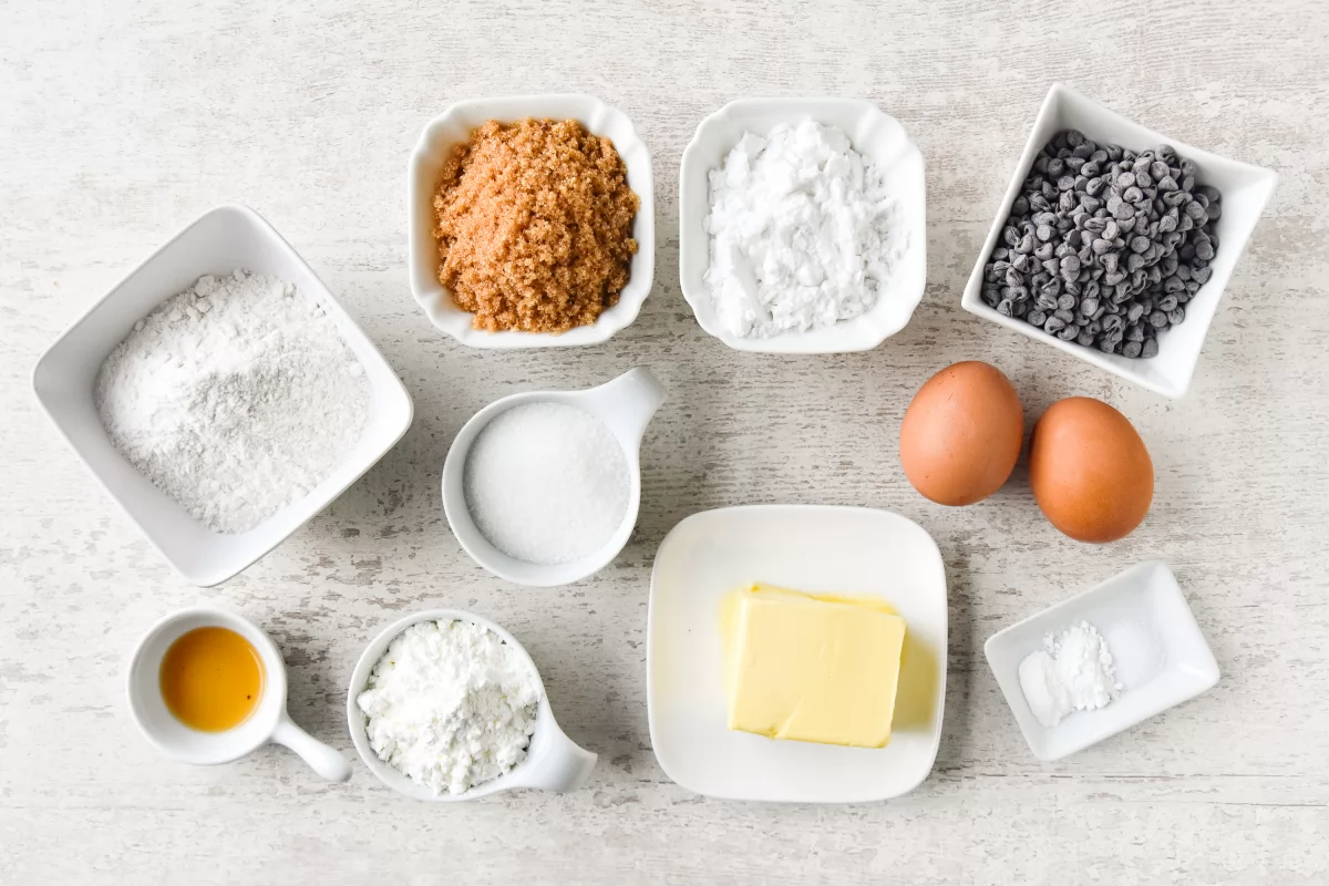 El resto de los ingredientes son los habituales en la masa de las cookies: mantequilla, huevos y pepitas de chocolate. Estos componentes aportan sabor, estructura y la textura característica que se espera de este tipo de galletas.