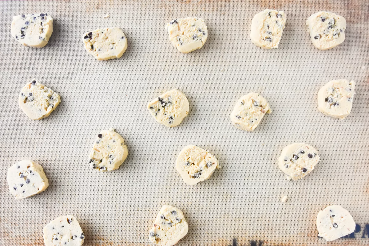6- Precalienta el horno a 180 °C. Mientras tanto, corta el rulo de masa en unas 15 porciones iguales y colócalas en una bandeja de horno cubierta con papel de hornear. Deja espacio entre ellas porque las galletas se expandirán durante la cocción.