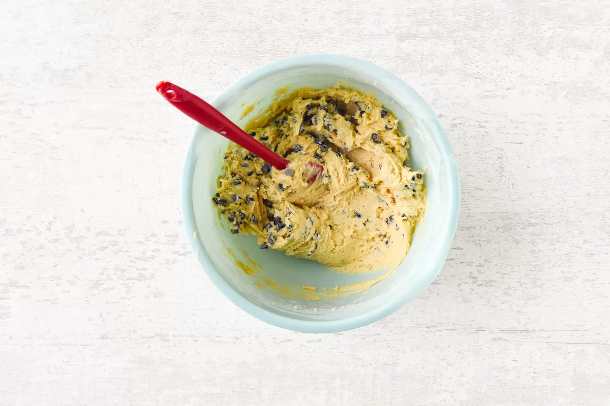 4- Añade 90 gramos de pepitas de chocolate y mezcla suavemente para distribuirlas por toda la masa. Reserva los 10 gramos restantes para decorar las galletas más adelante.
