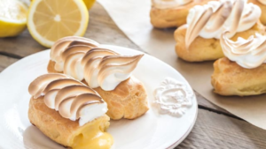 - Éclairs de lemon curd y merengue: Una versión renovada de los tradicionales éclairs franceses, con un relleno de lemon curd y una cobertura de merengue dorado.