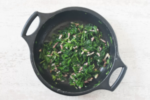 3- Incorporar las hojas de espinaca previamente lavadas y troceadas. Cocinar durante unos tres minutos, removiendo suavemente, hasta que reduzcan su volumen y liberen su humedad. Es importante permitir que el exceso de líquido se evapore para evitar una salsa demasiado aguada.