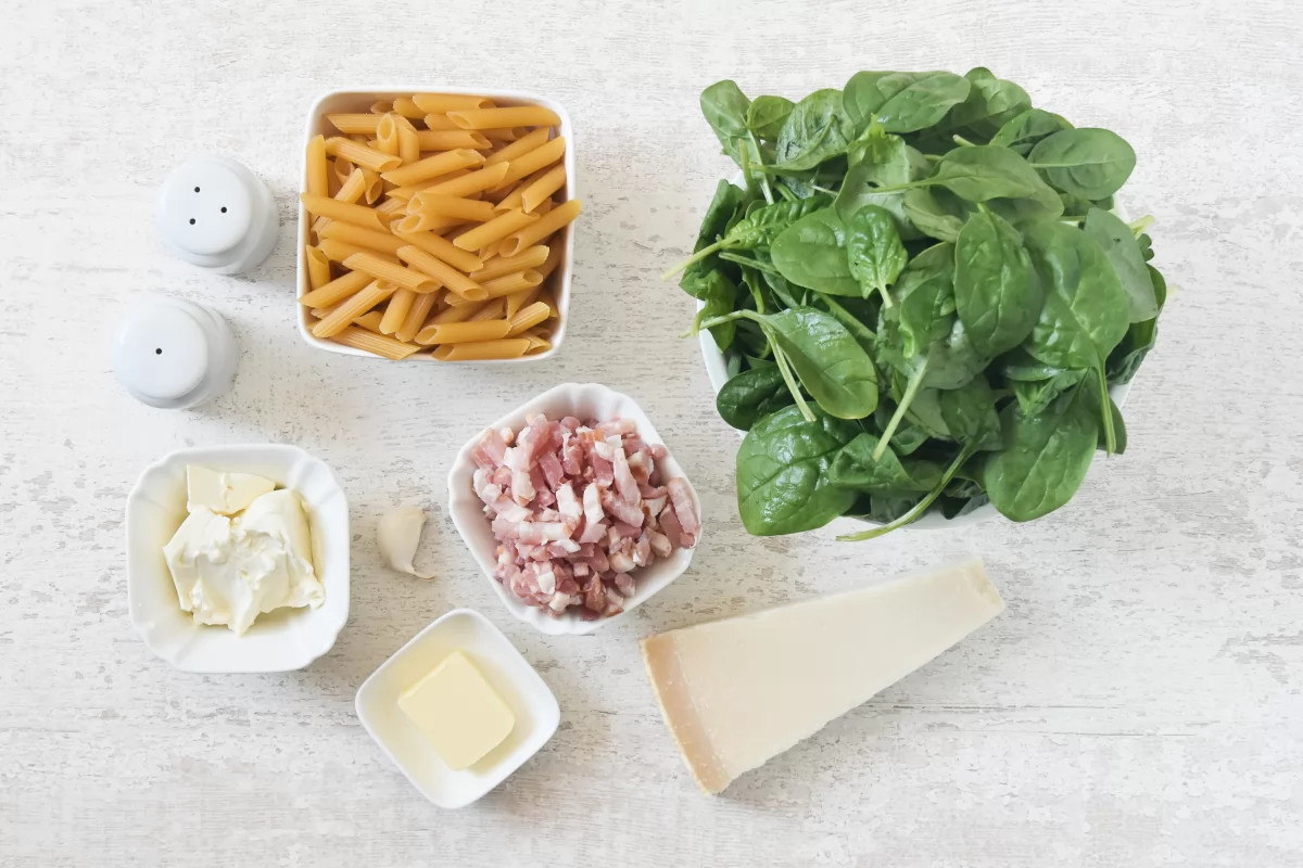 El secreto de esta receta está en la combinación de ingredientes simples que, al unirse, crean un plato reconfortante. El ajo aporta un toque aromático, el bacon suma intensidad y la mezcla de quesos genera una textura suave y envolvente. Todo esto se integra con la espinaca, que aporta frescura y un contraste vegetal que equilibra el conjunto.