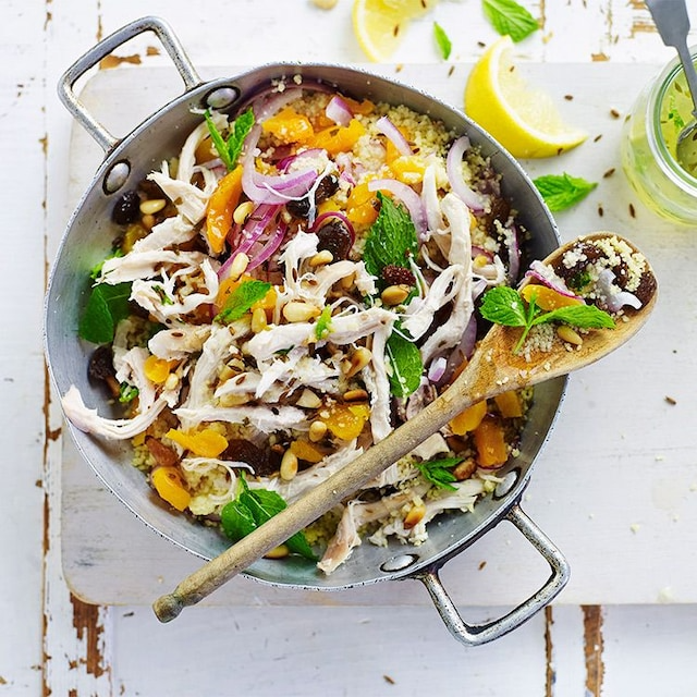 Mezcla cuscús cocido con pollo desmenuzado, frutos secos como almendras y pasas, y frutas como granada. Añade un aderezo de menta, comino y limón para un toque refrescante.