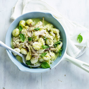 Prepara ñoquis caseros o utiliza los comprados. Combínalos con pollo desmechado y una salsa pesto fresca. Este plato es ideal para los amantes de la pasta y los sabores intensos.
