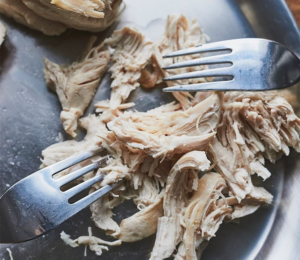 • Retira el pollo del agua y escúrrelo. Utiliza dos tenedores para desmenuzar la carne hasta obtener las hebras deseadas.