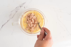 - Incorporar el atún previamente escurrido y desmenuzado.