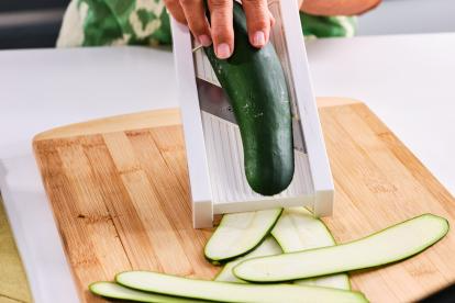 Lava bien los calabacines y córtalos en láminas finas a lo largo, utilizando una mandolina o un pelador ancho. Procura que todas las láminas tengan un grosor similar para que se cocinen de manera uniforme y se puedan enrollar sin romperse.