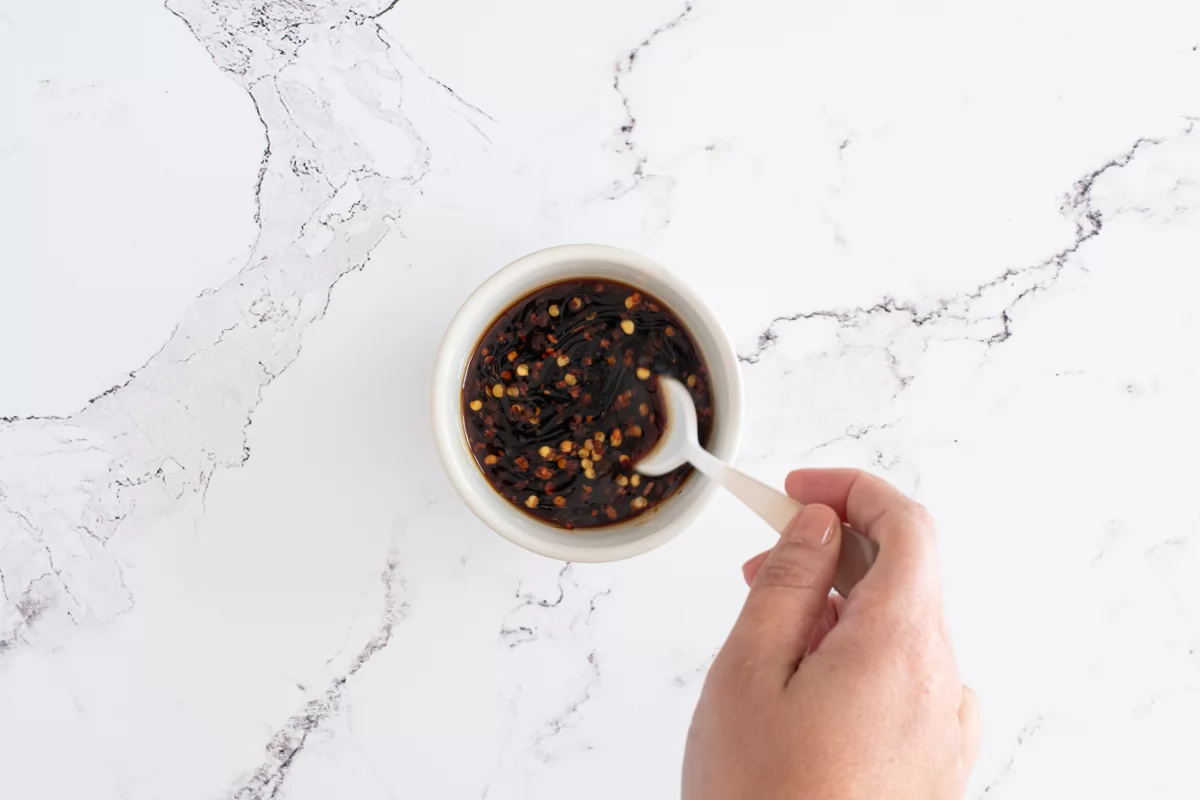 - En primer lugar, colocamos en un cuenco 60 ml de salsa de soja junto con 1 cucharada de vinagre de arroz. Añadimos también 1 cucharadita de aceite de sésamo, que aportará un aroma muy característico a la mezcla. Incorporamos media cucharadita de copos de guindilla para darle un toque ligeramente picante y media cucharadita de azúcar blanco, que ayudará a equilibrar la acidez del vinagre y la intensidad de la soja. Mezclamos bien todos los ingredientes hasta que el azúcar se disuelva por completo.