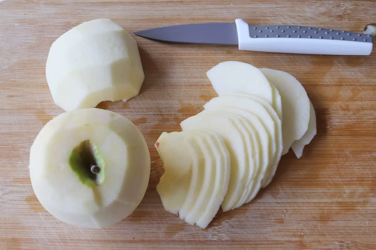 Pelá las dos manzanas reservadas, quitá el corazón y cortalas en láminas finas. Colocá las rodajas sobre la superficie de la masa, cubriéndola por completo. Podés acomodarlas en forma circular o superpuestas, según tu preferencia.