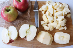 Para comenzar, pelá tres manzanas, retirales el corazón y las pepitas, y cortalas en trozos pequeños. Estas serán las que se integren a la masa. Las dos manzanas restantes reserválas para la decoración final de la tarta.