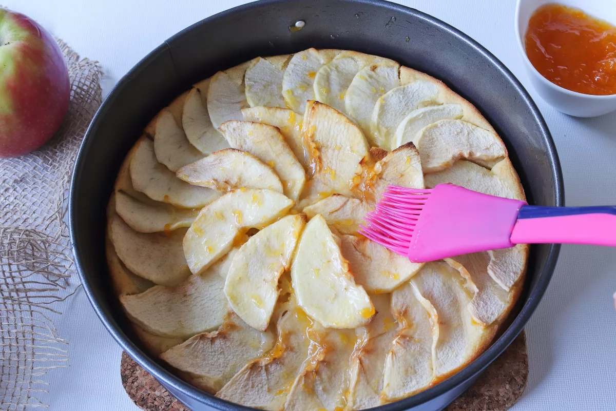 Antes de hornear, se suman rodajas de manzana en la superficie, que no solo aportan sabor, sino también una presentación atractiva. El toque final lo da la mermelada de melocotón, pincelada al salir del horno, que le otorga brillo y un delicado contraste dulce. El resultado es una tarta equilibrada, húmeda y aromática, perfecta para disfrutar fría.