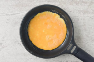 3- Calentamos una sartén antiadherente a fuego medio-bajo y añadimos la mantequilla o el aceite de oliva. Cuando esté caliente, vertemos los huevos batidos y dejamos que comiencen a cuajarse lentamente. Es importante no subir demasiado el fuego para evitar que la base se dore en exceso o se cocine de manera desigual.
