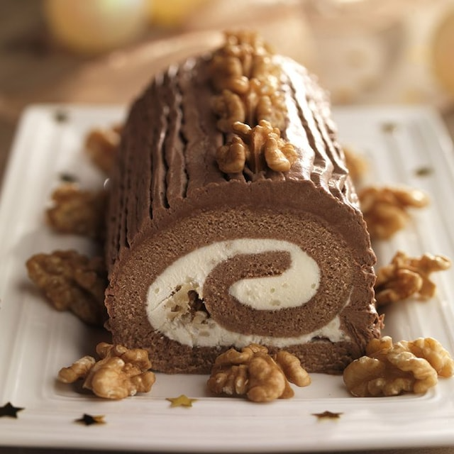 Integra este clásico de la repostería española en tu tronco navideño utilizando turrón de Jijona en la crema del relleno. Es una opción que no puede faltar en las mesas españolas durante las fiestas.