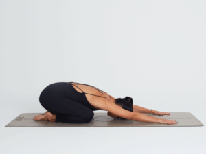 Esta variación de la conocida postura de “niño” del yoga se centra en relajar la espalda baja, los glúteos y los muslos. Es un estiramiento suave que ayuda a liberar tensiones acumuladas en esas áreas.