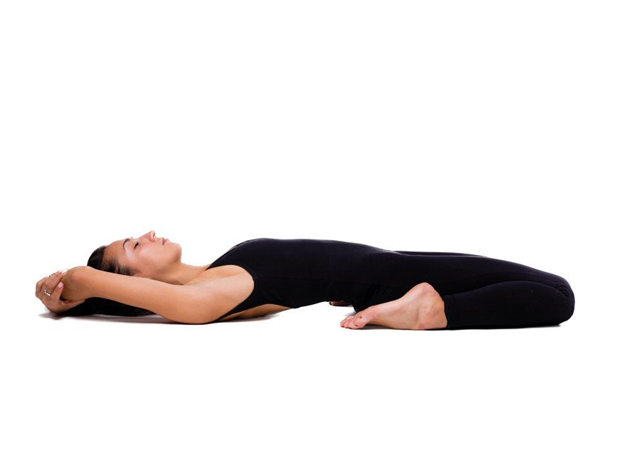 - Inclina tu torso hacia adelante y recarga el pecho sobre las almohadas, dejando que los brazos se extiendan hacia adelante de manera relajada.