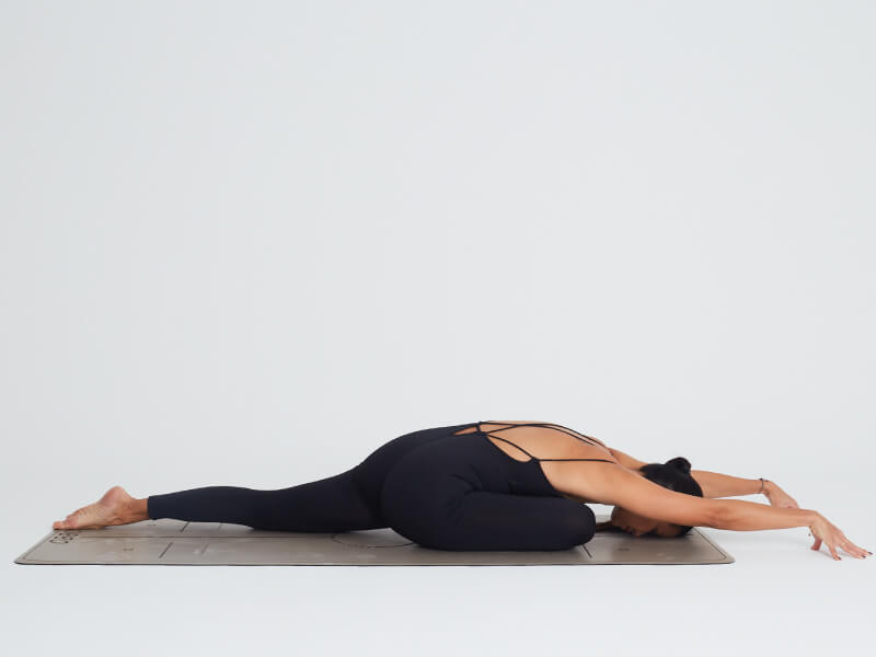 Este movimiento es excelente para liberar tensiones en las caderas y la zona lumbar, mientras trabajas en la flexibilidad general del cuerpo.