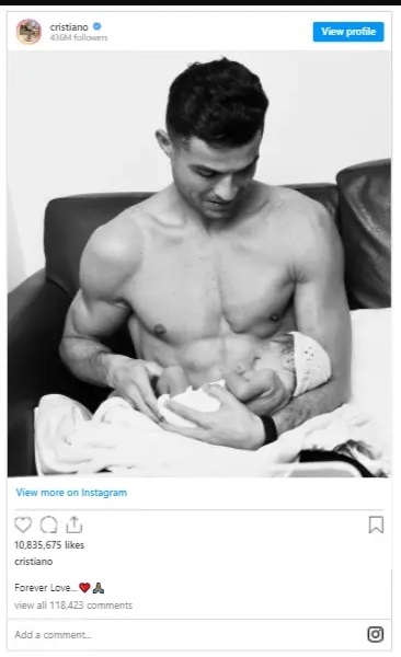 «Amor para siempre». Junto a estas palabras Cristiano Ronaldo ha compartido en las redes sociales una fotografía en blanco y negro, la más personal que se recuerda del futbolista, con su hija recién nacida.
