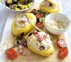 Las patatas cocidas en el microondas conservan mejor su textura. Una vez cocidas, se vacían parcialmente y se rellenan con una mezcla de queso crema, mostaza, miel y jamón cocido. Se gratinan al horno para obtener una textura dorada y fundente.