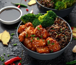 En este plato, el brócoli cocido al vapor o a la manera tradicional es la guarnición perfecta para un sabroso pollo teriyaki. El arroz salvaje completa el conjunto, formando una comida equilibrada y deliciosa que combina proteínas, fibra y vegetales.