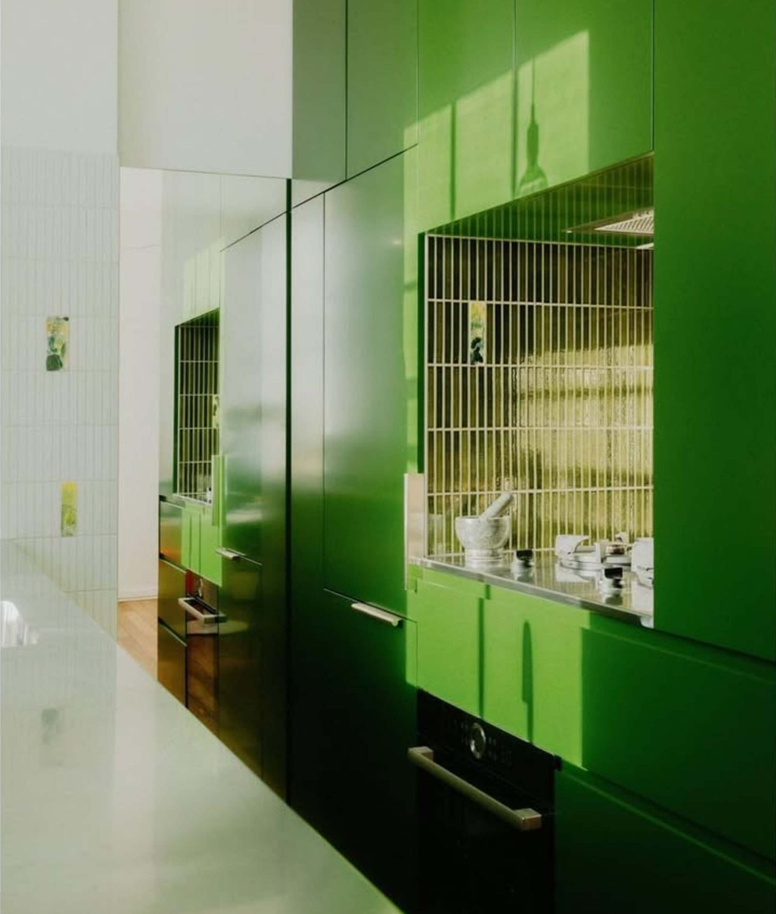 En cocinas, el Brat Green puede aplicarse en gabinetes, azulejos o paredes, complementado con madera clara o mármol blanco para un contraste equilibrado. En exteriores, es ideal para paredes de patios, maceteros o muebles de jardín, donde se integrará de forma natural con el entorno.