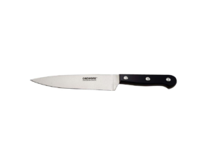 También conocido como cuchillo de cocinero o cebollero, es el más versátil y el verdadero protagonista de la cocina. Su hoja suele medir entre 20 y 25 centímetros y presenta una ligera curvatura que permite realizar el clásico movimiento de balanceo al cortar. Es ideal para picar verduras, rebanar carnes, trocear hierbas y cortar prácticamente cualquier ingrediente. Si tuvieras que elegir un solo cuchillo, este sería el indicado, ya que resuelve la mayoría de las tareas con comodidad y precisión.
