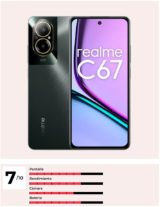 El realme C67 es un móvil sencillo y funcional con un diseño que resulta cómodo en la mano y visualmente atractivo. Su pantalla de 6,72 pulgadas incorpora la función Mini Capsule 2.0, ubicada junto a la cámara frontal, la cual permite ver animaciones y controlar la música de manera sencilla. Este detalle hace que el realme C67 se destaque entre los móviles low cost, ya que añade un toque de personalización y facilita la navegación.