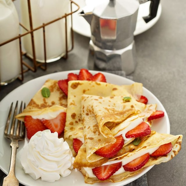 Las crepes son siempre un éxito, y su versatilidad permite adaptarlas a cualquier ocasión. Puedes hacerlas con distintos tipos de harina e, incluso sustituir la leche de la receta original, por alguna bebida vegetal. Aquí las rellenamos con una mezcla de queso crema, crema montada y azúcar, acompañadas de frutillas frescas.