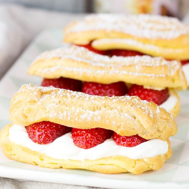 - Abre los éclairs por la mitad, rellena con la crema montada y las frutillas, y vuelve a cerrar. Decora con azúcar glas o chocolate derretido si lo deseas.