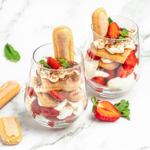 Este postre es lo mejor cuando tienes poco tiempo, pero quieres algo rápido y delicioso para tomar al final de una comida o una cena. El formato en vasitos no solo es práctico, sino también muy vistoso. Lo único que tienes que hacer es montar la crema con azúcar y un poco de vainilla -no te olvides de que esté bien fría antes para que suba bien-. Luego se trata de mezclar en unos vasitos unos trozos de bizcochos soletilla, unas frutillas y un poco de cacao en polvo.