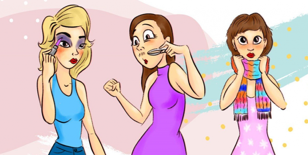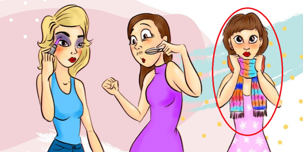 Por supuesto, puedes pensar en la primera chica que usa lápiz labial de una manera extraña. Puedes mirar con recelo a la segunda joven, que se está deshaciendo del bigote. Pero estamos bastante seguros de que si hay un chico aquí, se está escondiendo bajo la apariencia de una tercera jovencita. Y el pañuelo cubre la nuez de Adán, que ni la primera ni la segunda tienen.