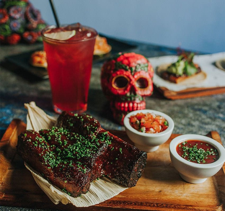 La carta, pensada para compartir, incluye tacos de cochinita pibil o solomillo, guacamole con aguacate de Michoacán, ti-kin-sic de corvina, costillitas cantineras y el “machete del matarife”, costilla de ternera terminada al carbón con salsa ahumada. Los postres caseros —crepas de cajeta, tarta de queso o pastel tres leches— y un menú del día competitivo completan la oferta.