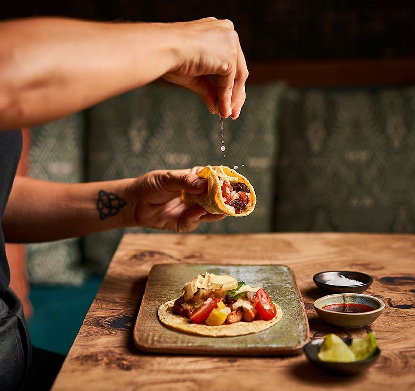 En carta encontramos tacos de cochinita pibil, tinga de pollo, opciones veganas con nopales y champiñones o propuestas marinas como el tulum de calamar. Se acompañan de totopos con salsas exclusivas y bebidas como aguas frescas de tamarindo o hibiscus, micheladas y margaritas de distintos sabores.