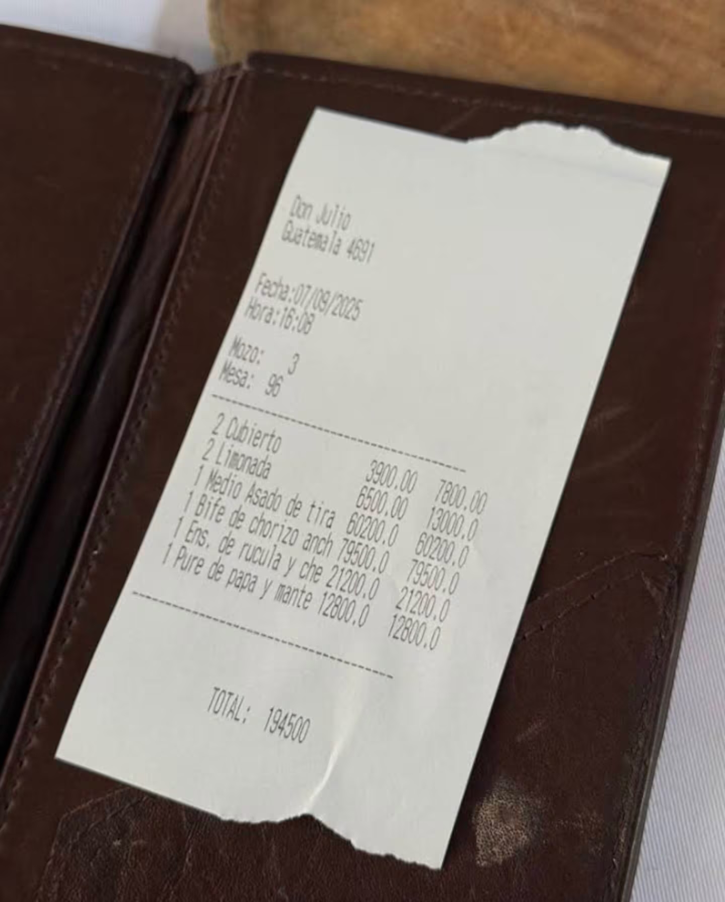 El cubierto, por persona, tuvo un valor de $3900. Cada limonada costó $6500. El medio asado de tira se ubicó en los $60.200, mientras que el bife de chorizo ancho ascendió a $79.500. A eso se sumó la ensalada por $21.200 y el puré por $12.800. En total, el consumo de ambos alcanzó los $194.500, una cifra que, aunque alta, el cliente justificó por la exclusividad de la experiencia y la categoría del lugar.