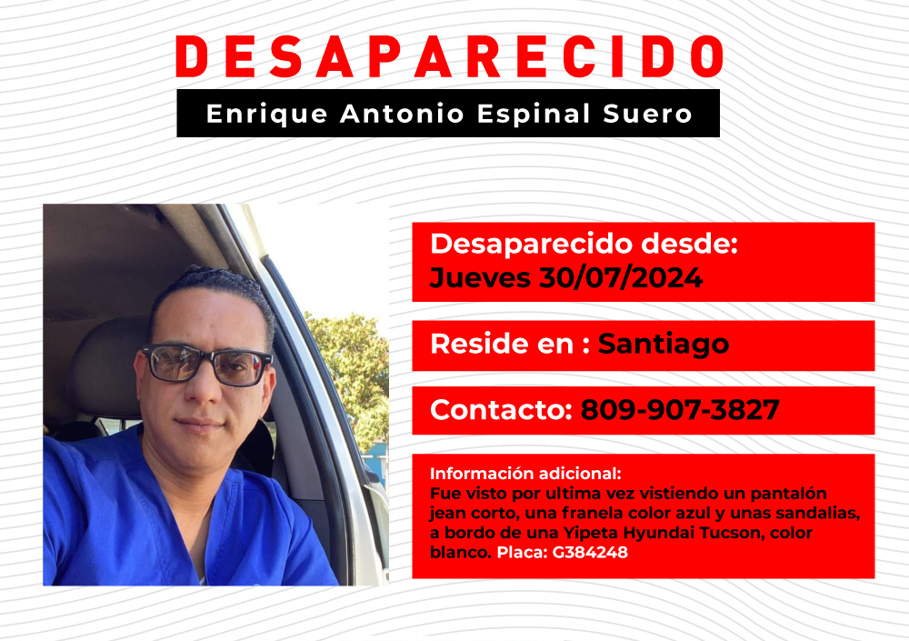 Familiares y amigos se encuentran profundamente preocupados por la desaparición de Enrique Antonio Espinal Suero, un respetado pediatra de 48 años, residente del sector Villa Olga en Santiago. El drama comenzó cuando Enrique, conocido por su dedicación y compromiso con su trabajo en el Hospital Materno Infantil José Francisco Peña Gómez en Mao, provincia Valverde, no regresó a casa la noche del pasado martes.