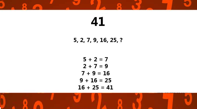 La idea del patrón es que cada número de la serie, excepto los dos primeros números, es la suma de los dos números anteriores.