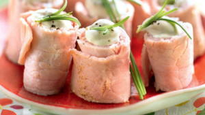 - Corta las lonchas de jamón en rectángulos de 12×4 cm.