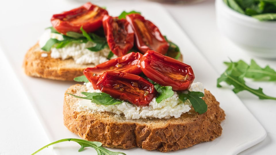 - Coloca encima unas hojas de rúcula y los tomates secos.