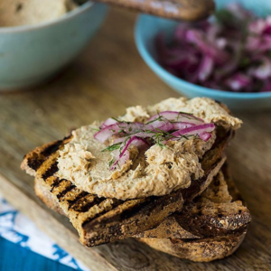 • Repartir la mezcla de atún sobre las rebanadas y añadir la cebolla y el eneldo por encima.