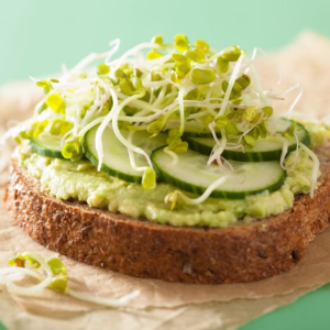 • Colocar las rodajas de pepino y añadir los germinados por encima antes de servir.