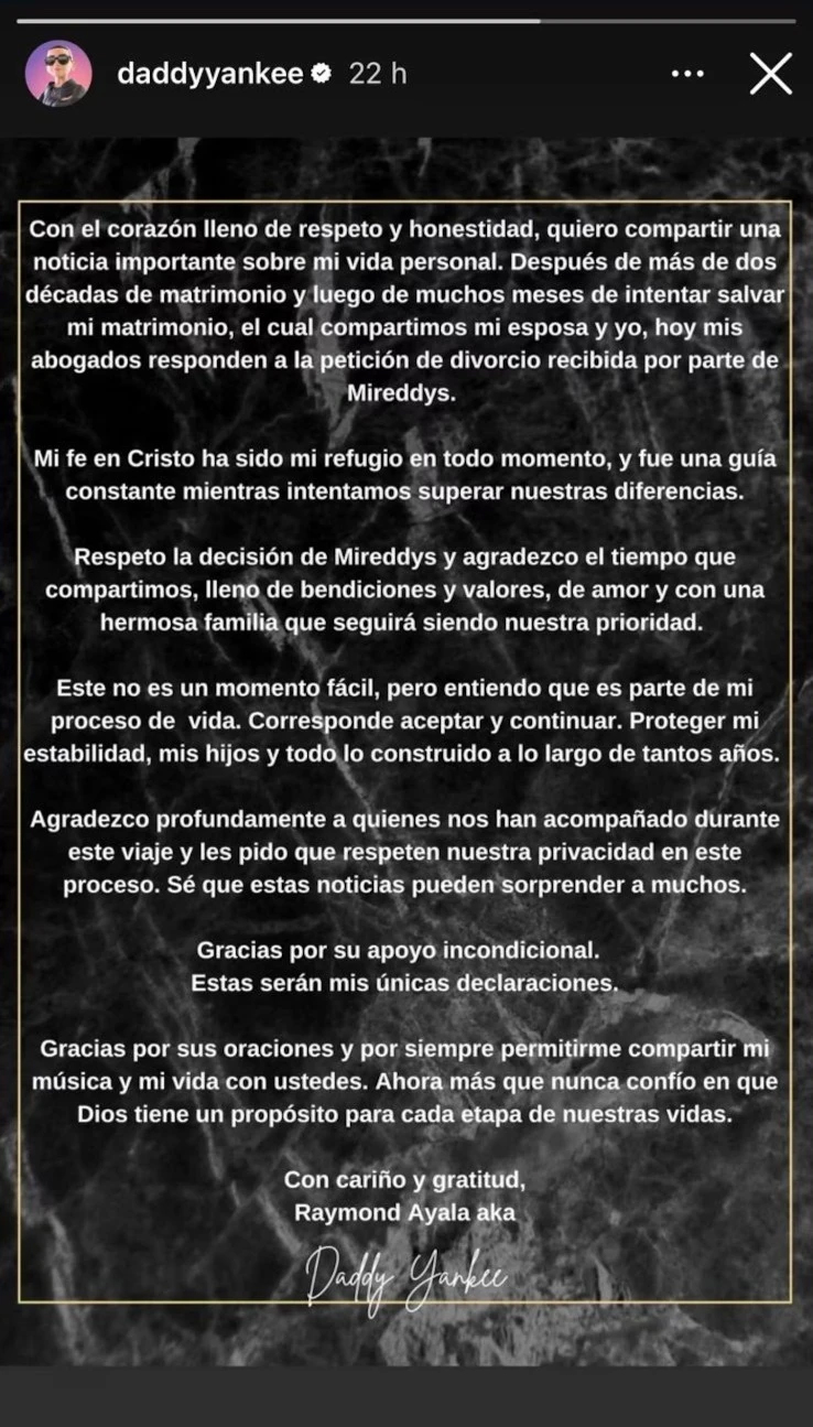 En su comunicado, Daddy Yankee reveló que la decisión de separarse fue iniciada por Mireddys, quien presentó la petición de divorcio. “Después de más de dos décadas de matrimonio y luego de muchos meses de intentar salvar mi relación, hoy mis abogados responden a la petición de divorcio presentada por Mireddys”, escribió el cantante, dejando claro que este no fue un desenlace fácil para ninguno de los dos.