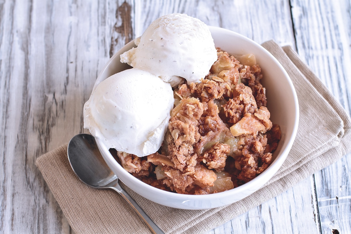 El crujiente de manzana es una adaptación estadounidense del crumble británico. La diferencia principal es que, además de la mantequilla, el azúcar y la harina, este postre incluye copos de avena en su cobertura, lo que le da un toque más saludable y nutritivo.