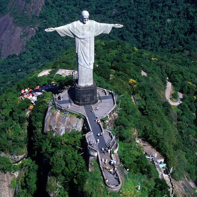 Ubicada sobre el monte Corcovado, a 710 metros de altitud, esta colosal estatua de Jesucristo es el símbolo más reconocido de Río de Janeiro. Con 30 metros de altura, 28 de ancho y un pedestal de 8 metros, el Cristo Redentor domina la ciudad desde el Parque Nacional de Tijuca, la selva urbana más grande del mundo.
