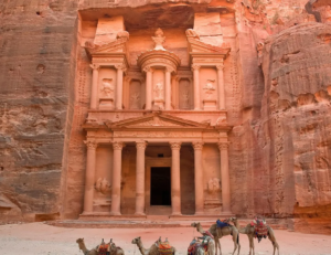 En el desierto jordano se alza Petra, la antigua capital del reino nabateo. Esta ciudad excavada en piedra rosa fue un importante centro comercial en la Antigüedad y su entrada se realiza a través del Siq, un desfiladero estrecho de altos muros que desemboca en la imponente fachada del Tesoro, su monumento más célebre.